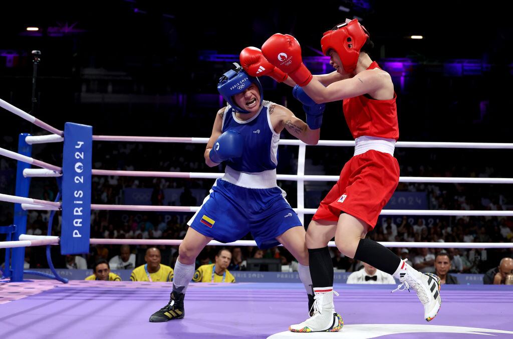 PARIS, FRANCE - AUGUST 01: Yeni Marcela Arias Castaneda of Team Colombia punches Aeji Im of Team Republic of Korea during the Women's 54kg Quarter-final match against Aeji Im of Team Republic of Korea on day six of the Olympic Games Paris 2024 at North Paris Arena on August 01, 2024 in Paris, France. (Photo by Richard Pelham/Getty Images) / Richard Pelham