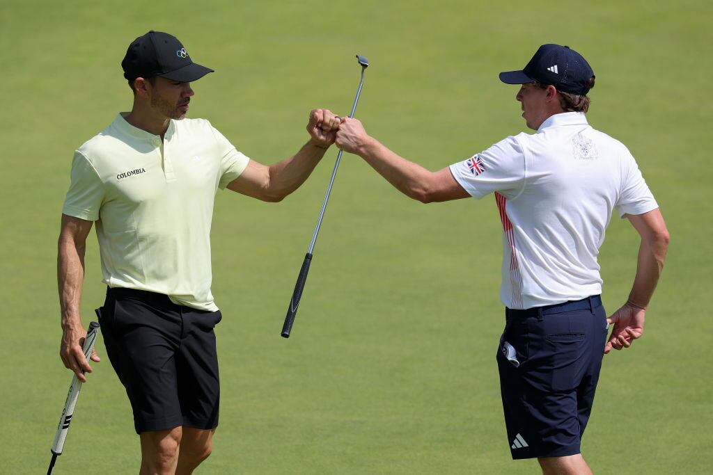 PARIS, FRANCE - JULY 30: Camilo Villegas of Team Colombia interacts with Matthew Fitzpatrick of Team Great Britain on the ninth hole during a practice round ahead of the Men's Individual Stroke Play on day four of the Olympic Games Paris 2024 at Le Golf National on July 30, 2024 in Paris, France. (Photo by Kevin C. Cox/Getty Images) / Kevin C. Cox