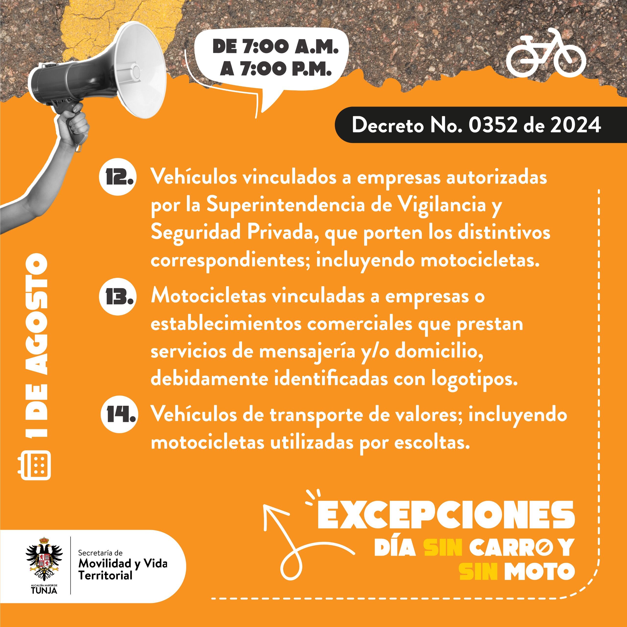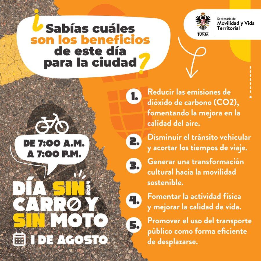 La Alcaldía de Tunja, mediante el Decreto 0352 del 17 de julio del 2024, promueve el modo de transporte sostenible conocido como el Día sin Carro y sin Moto en la ciudad, con el fin de reducir en un 40 % las emisiones de CO2 y generar un ambiente más sano y saludable para los tunjanos, además de incentivar a los ciudadanos a movilizarse en transporte público.