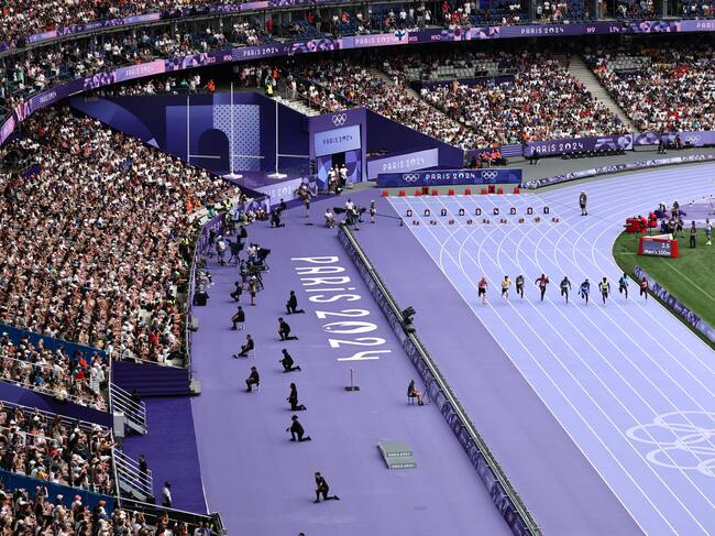 Prueba de los 100 metros planos en París 2024. Foto: EFE / EPA / ANNA SZILAGYI / ANNA SZILAGYI (EFE)