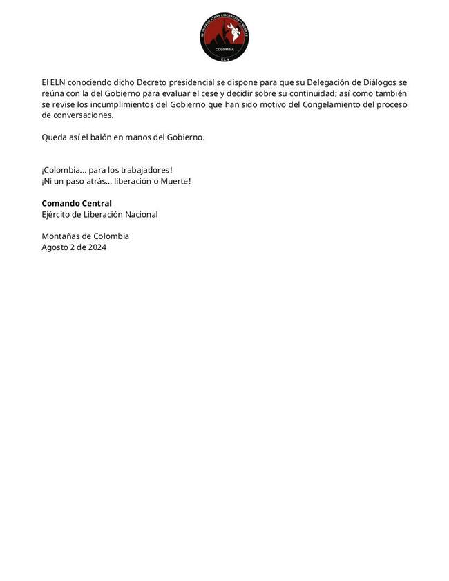 “El ELN conociendo dicho decreto presidencial se dispone para que su delegación de diálogos se reúna con la del Gobierno para evaluar el cese y decidir sobre su continuidad; así como también se revisen los incumplimientos del Gobierno que han sido motivo de congelamiento”, señaló el grupo armado ilegal.