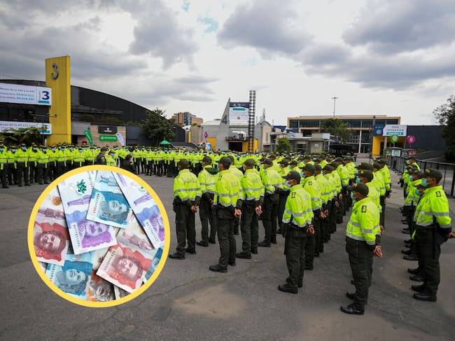 Uniformados de la Policía Nacional de Colombia. En el círculo, billetes colombianos (GettyImages)