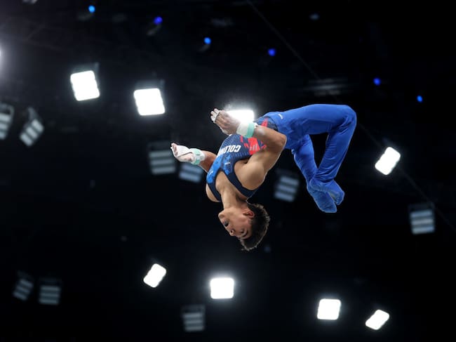 PARIS, FRANCE - AUGUST 05: Angel Barajas of Team Colombia competes in the Artistic Gymnastics Men's Horizontal Bar Final on day ten of the Olympic Games Paris 2024 at Bercy Arena on August 05, 2024 in Paris, France. (Photo by Elsa/Getty Images) / Elsa
