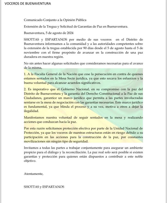 A través de un comunicado, los voceros de las bandas delincuenciales Shottas y Espartanos, que participan en la mesa sociojurídica de Buenaventura, anunciaron que la extensión de su tregua será por 90 días, la cual entró en vigencia este lunes 5 de agosto.