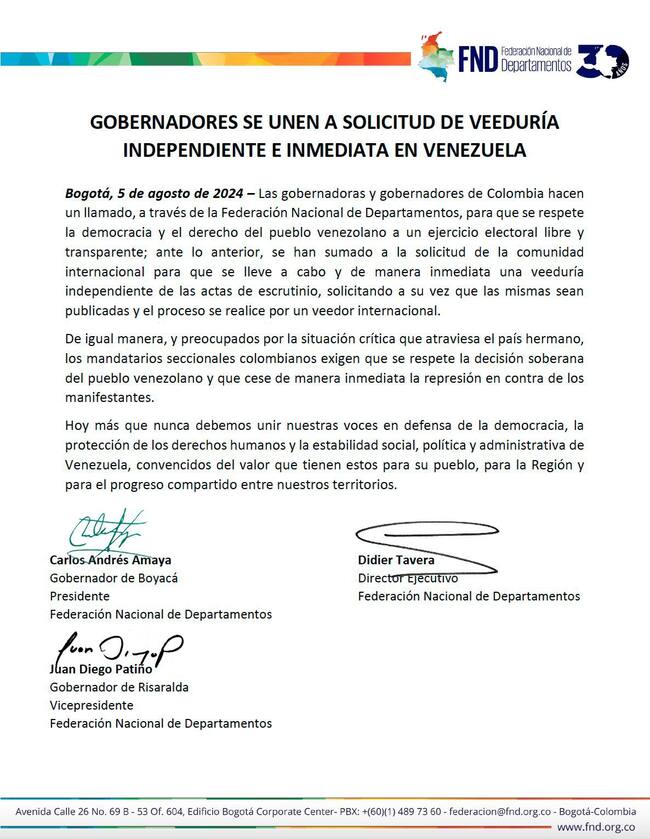 Desde la Federación Nacional de Departamentos emitieron un comunicado en el marco de la crisis política en Venezuela, en el que hicieron un llamado para garantizar la democracia y el derecho del pueblo venezolano a un proceso electoral transparente.