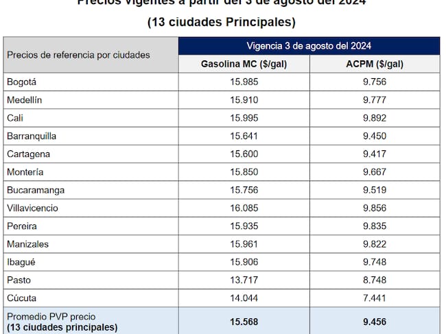 A través de una resolución, la Comisión de Regulación de Energía y Gas (CREG) anunció ajustes a los precios de la gasolina y el ACPM durante el inicio del este agosto; así las cosas, el precio promedio en las 13 principales ciudades de Colombia para el galón de gasolina se ubicó en 15.568 pesos y, por el lado del galón de ACPM, se fijó en 9.456 pesos.