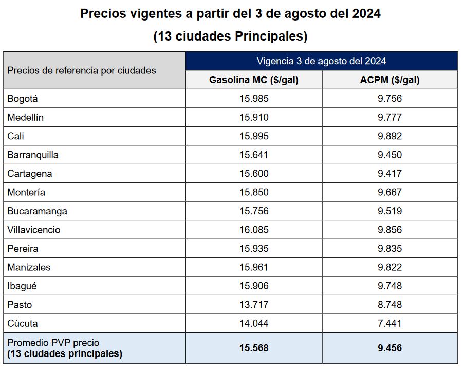 A través de una resolución, la Comisión de Regulación de Energía y Gas (CREG) anunció ajustes a los precios de la gasolina y el ACPM durante el inicio del este agosto; así las cosas, el precio promedio en las 13 principales ciudades de Colombia para el galón de gasolina se ubicó en 15.568 pesos y, por el lado del galón de ACPM, se fijó en 9.456 pesos.