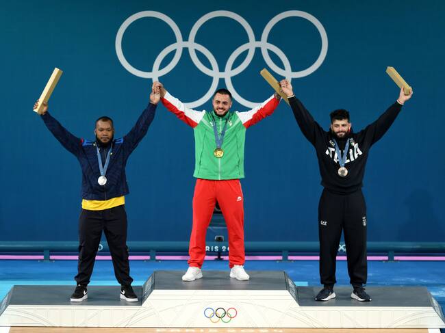 Agosto 9. Ganadores de la categoria de halterofilia. Karlos May Nasar, Yeison López y Antonino Pizzolato. I Foto: Lars Baron/Getty Images. / Lars Baron