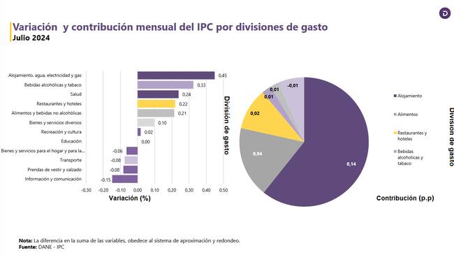 La entidad estadística explicó que la división de gasto con mayor contribución para esa medición fue alojamiento, agua electricidad y gas con 0,14%; allí Piedad Urdinola, directora del Dane, reiteró que sigue siendo el rubro de los arriendos el que más jalona “tanto como la renta imputada, como la renta efectiva son las que están aportando mayor contribución”, agregó que de igual forma se empieza a ver que ya hay una tendencia en los estancamientos en los precios de los arrendamientos. Las otras divisiones de gasto que evitaron que la inflación fuera más baja en su medición mensual durante julio fueron: bebidas alcohólicas y tabaco; salud; restaurantes y hoteles.
