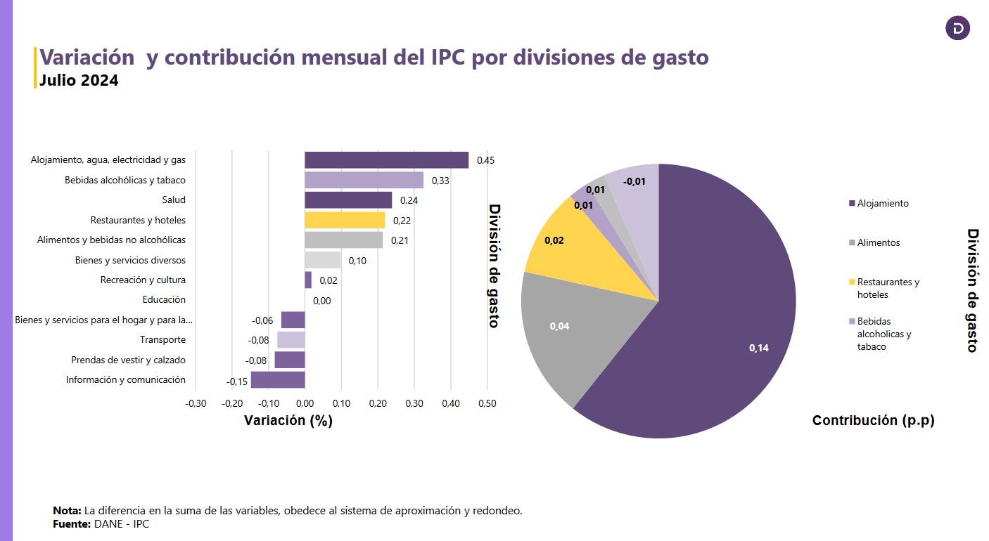 La entidad estadística explicó que la división de gasto con mayor contribución para esa medición fue alojamiento, agua electricidad y gas con 0,14%; allí Piedad Urdinola, directora del Dane, reiteró que sigue siendo el rubro de los arriendos el que más jalona “tanto como la renta imputada, como la renta efectiva son las que están aportando mayor contribución”, agregó que de igual forma se empieza a ver que ya hay una tendencia en los estancamientos en los precios de los arrendamientos. Las otras divisiones de gasto que evitaron que la inflación fuera más baja en su medición mensual durante julio fueron: bebidas alcohólicas y tabaco; salud; restaurantes y hoteles.