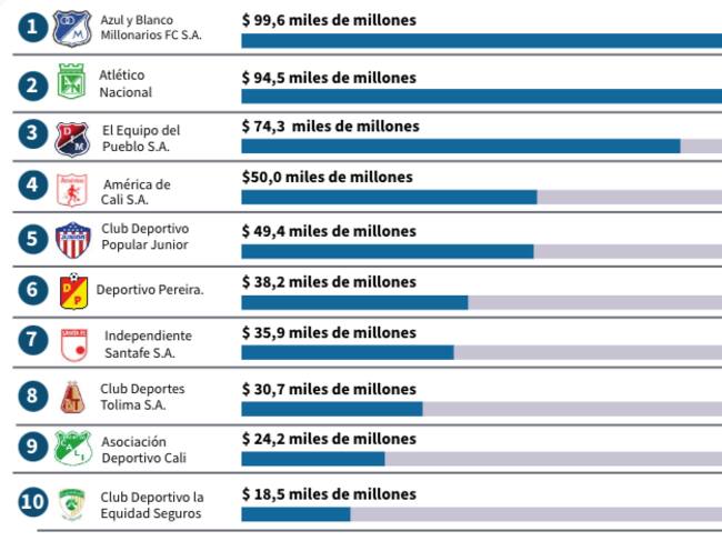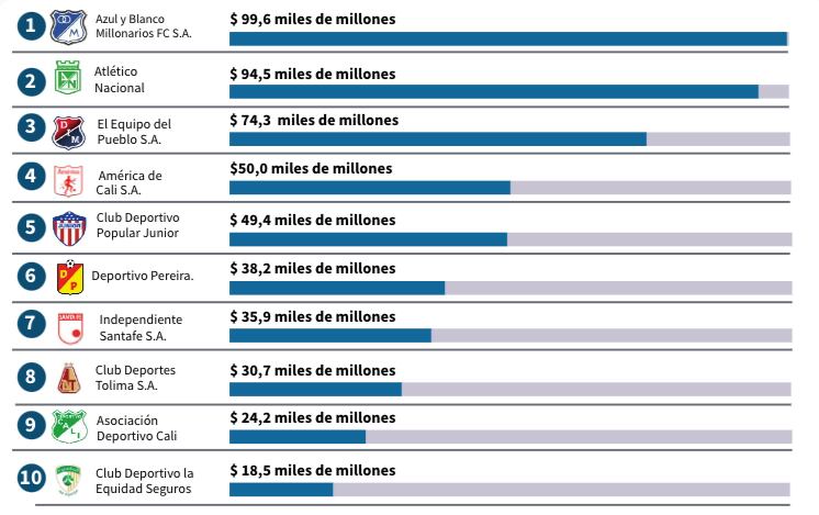 Millonarios (con $99.600 millones de ingresos), Nacional ($94.500 millones de ingresos) e Independiente Medellín ($74.300 millones de ingresos) son los tres equipos de fútbol masculino que más ingresos tuvieron el año pasado, según el reporte de la Superintendencia de Sociedades.