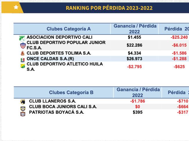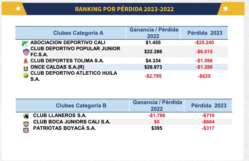 De otro lado, los que más perdieron fueron Deportivo Cali ($25.240 millones), Junior ($ 6.015 millones) y Tolima ( $ 1.586 millones)