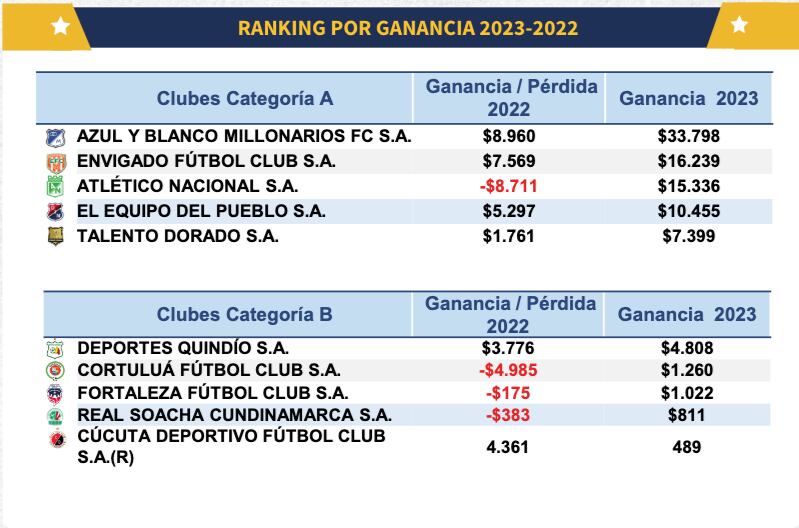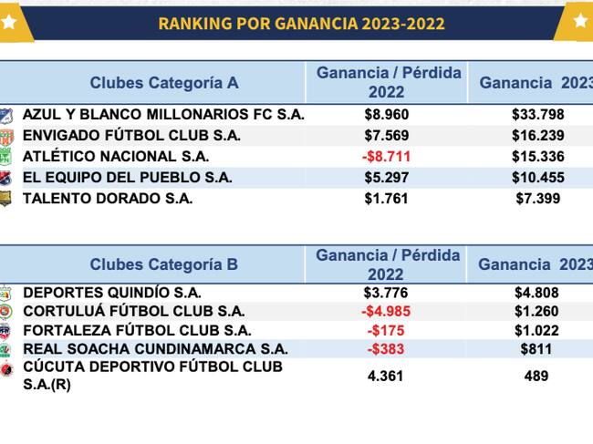 Entre tanto, los que más ganaron fueron Millonarios (con ganancias de $ 33.798 millones) Envigado (con ganancias de $ 16.239 millones) y Atlético Nacional (con ganancias de $ 15.336 millones)