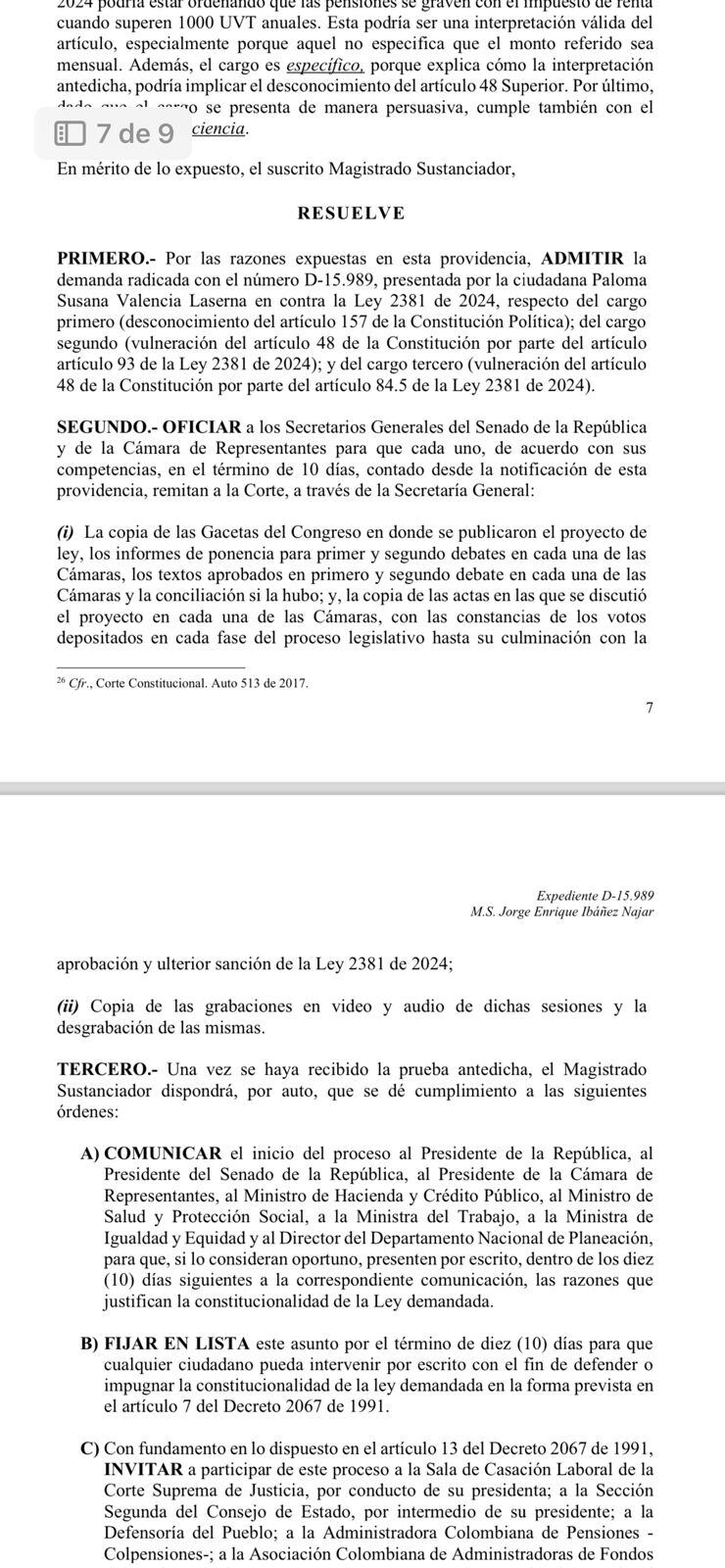 El alto tribunal encontró méritos para admitir la demanda y ordenó oficiar a los secretarios generales del Senado de la República y de la Cámara de Representantes para que cada uno, de acuerdo con sus competencias, en el término de 10 días, contado desde la notificación remitan a la Corte, a través de la Secretaría General: