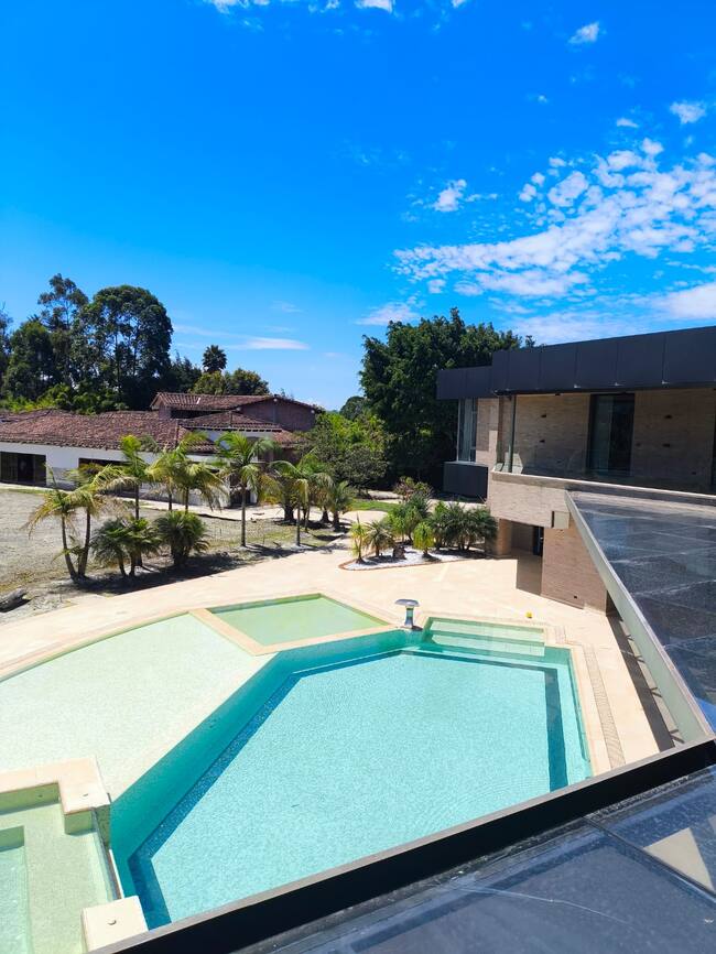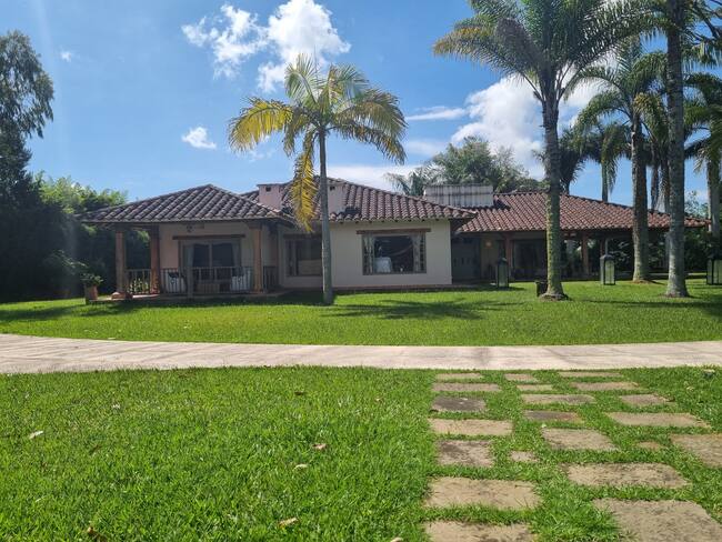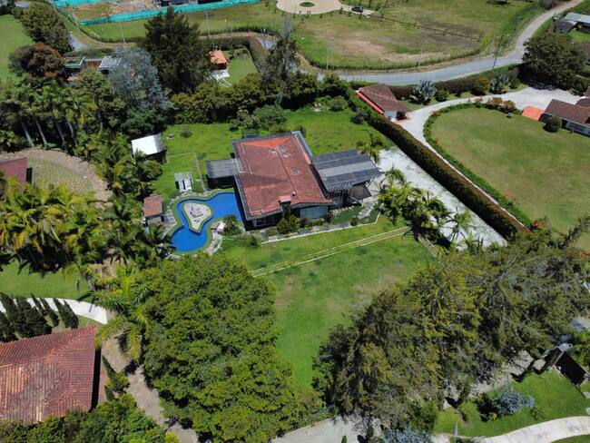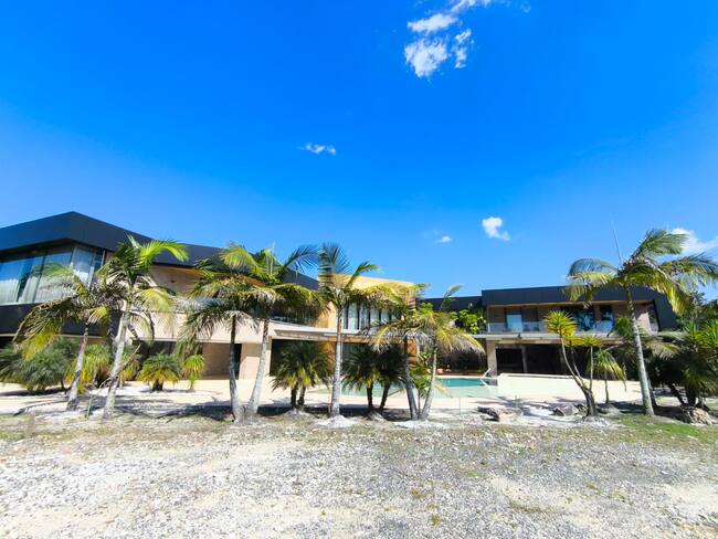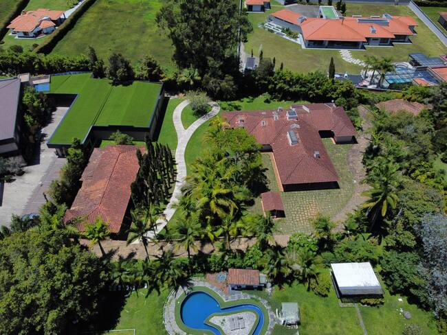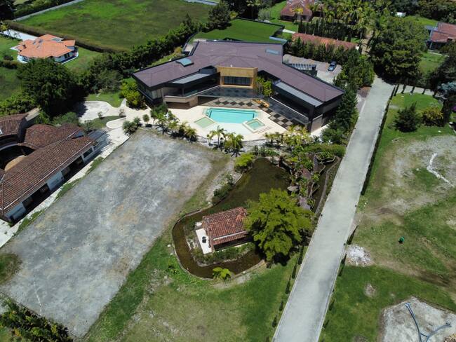 La primera propiedad es una casa de dos plantas con sótano, ubicado en un lote rural. Entre sus instalaciones se encuentran un estudio, sala de cine, salón de juegos, comedor, dos salas, fogata, zona de jacuzzi, piscina, gimnasio, despensa, pista de bolos, polígono de tiro, galería para autos con elevador, área de servicio con tres habitaciones y dos baños, jardines, biblioteca, turco, cuatro amplias alcobas con vestier y baño privado, bodega, cancha de fútbol, capilla, lago artificial y una fuente.