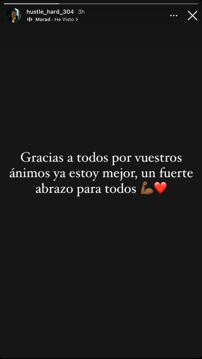 En el mensaje, que finalizaba con dos iconos: de fuerza y un corazón, se escuchaba de fondo un fragmento de una canción del rapero Morad: “Ahora me vienen do ‘tonto’, y quieren mi nombre a mí mancharme (no). Y no saben dónde cogerme (no), y no saben dónde darme (no). He visto la muerte de gente del barrio que nadie se acuerda de ello’ (no)”.