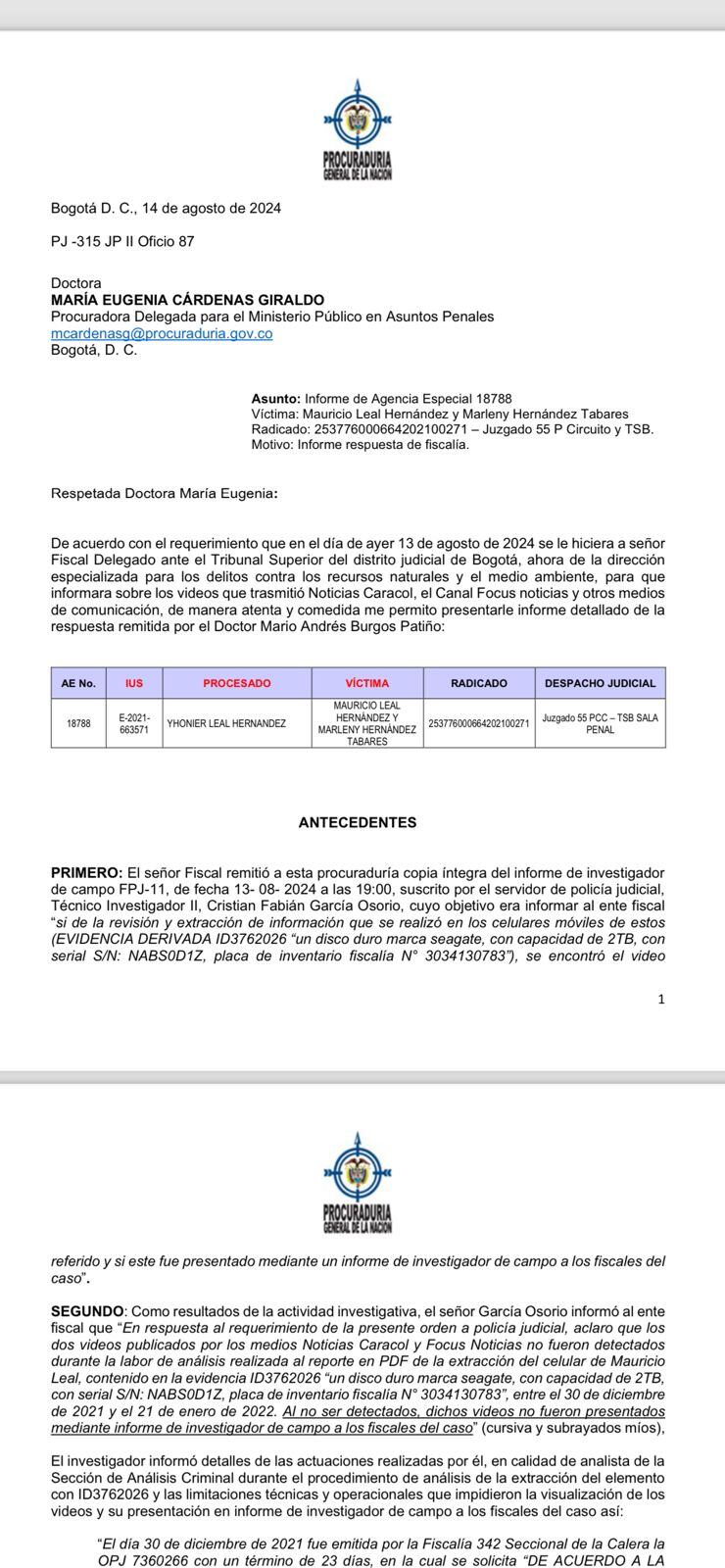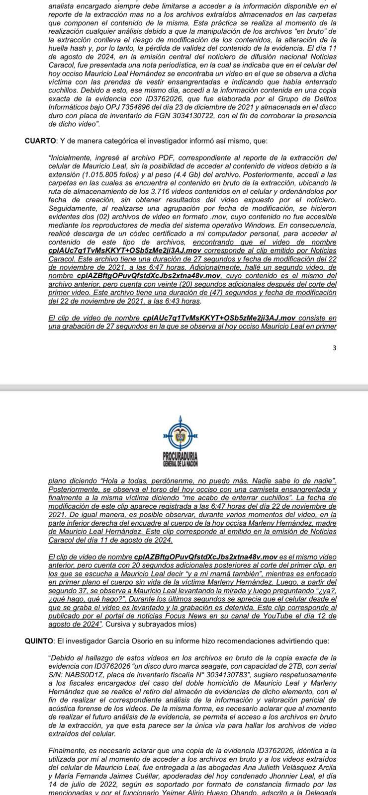 “Finalmente, es necesario aclarar que una copia de la evidencia ID3762026, idéntica a la utilizada por mí al momento de acceder a los archivos en bruto y a los videos extraídos del celular de Mauricio Leal, fue entregada a las abogadas Ana Julieth Velásquez Arcila y María Fernanda Jaimes Cuéllar, apoderadas del hoy condenado Jhonnier Leal, el día 14 de julio de 2022, según es soportado por formato de constancia firmado por las mencionadas y por el funcionario Yeimer Alirio Hueso Obando, adscrito a la Delegada para la Seguridad Territorial de la FGN”, recalca el informe de la Procuraduría en donde cita los hallazgos de la fiscalía, posterior a la publicación del video, que en un principio mostró una versión recortada en Noticias Caracol, y la original en Focus Noticias.