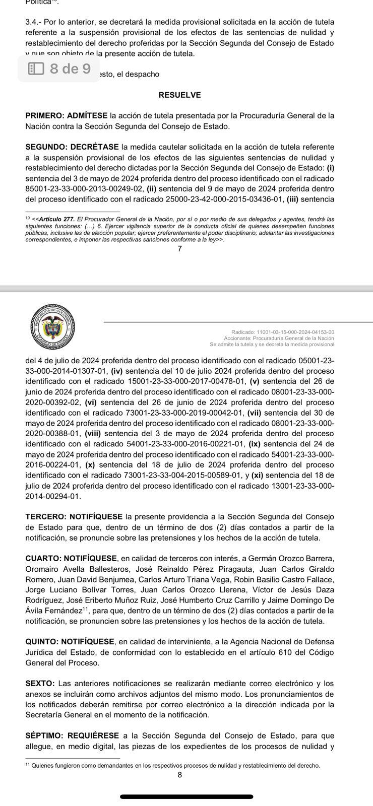 Se trata de 9 procesos en los que la Procuraduría General de la Nación anuló los nombramientos de funcionarios elegidos por voto popular, pero que, en su efecto, la sección segunda tumbó dichas sanciones basándose en la sentencia de la Corte IDH en el caso de Gustavo Petro.