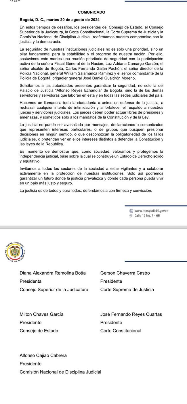 Tras la reunión, con la fiscal general de la Nación, Luz Adriana Camargo y el director de la Policía, William Salamanca, los magistrados hicieron un pronunciamiento conjunto en donde solicitan a las autoridades garantizar la seguridad “no solo la del Palacio de Justicia ‘Alfonso Reyes Echandía’ de Bogotá, sino la de los demás servidores y servidoras que laboran en esta y en todas las sedes judiciales del país”.