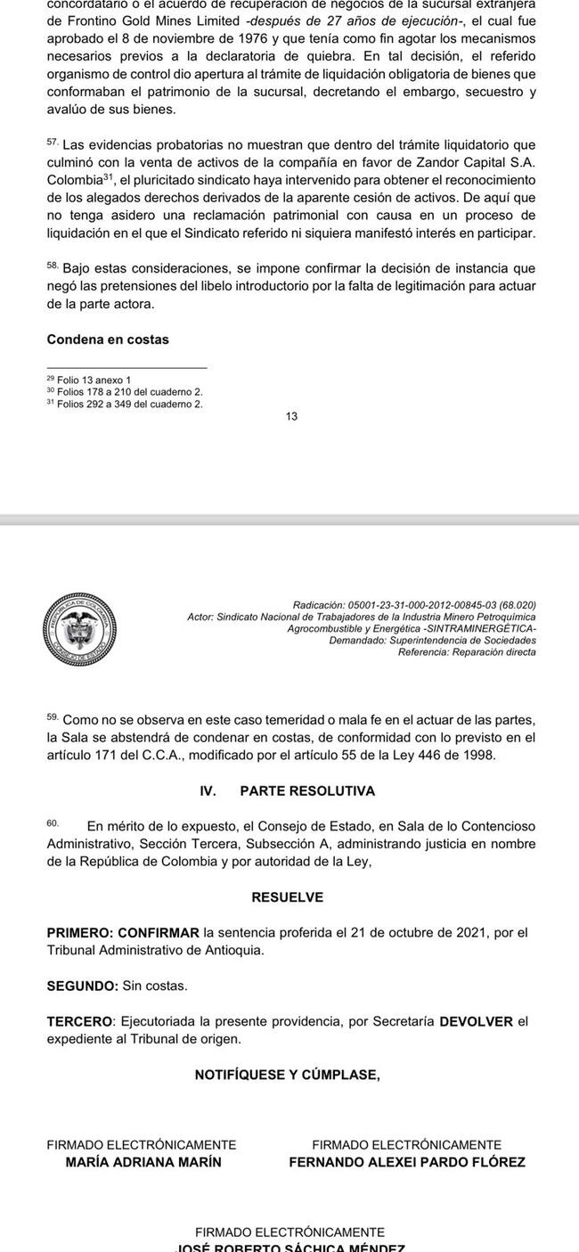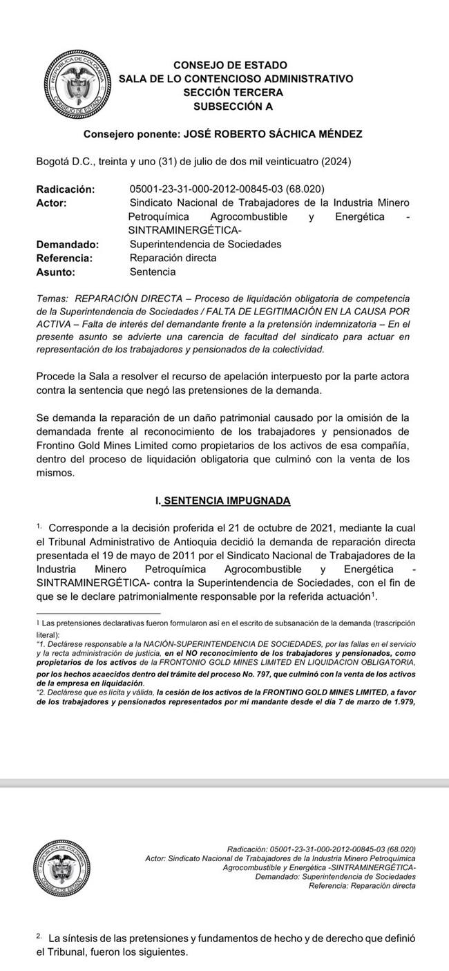 Dicho proceso fue emprendido por presuntas irregularidades en el proceso de liquidación forzosa de la compañía Frontino Gold Mines Limited.