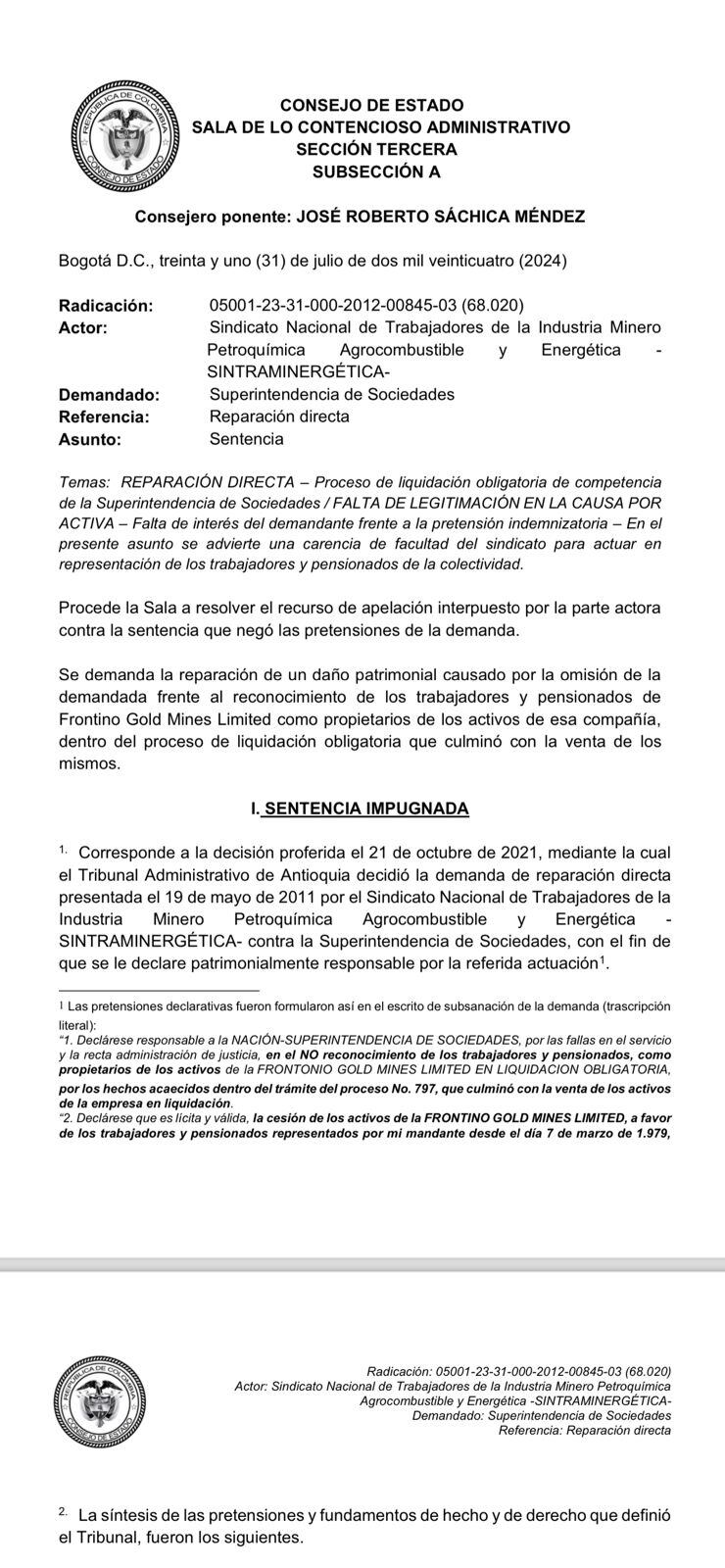 Dicho proceso fue emprendido por presuntas irregularidades en el proceso de liquidación forzosa de la compañía Frontino Gold Mines Limited.