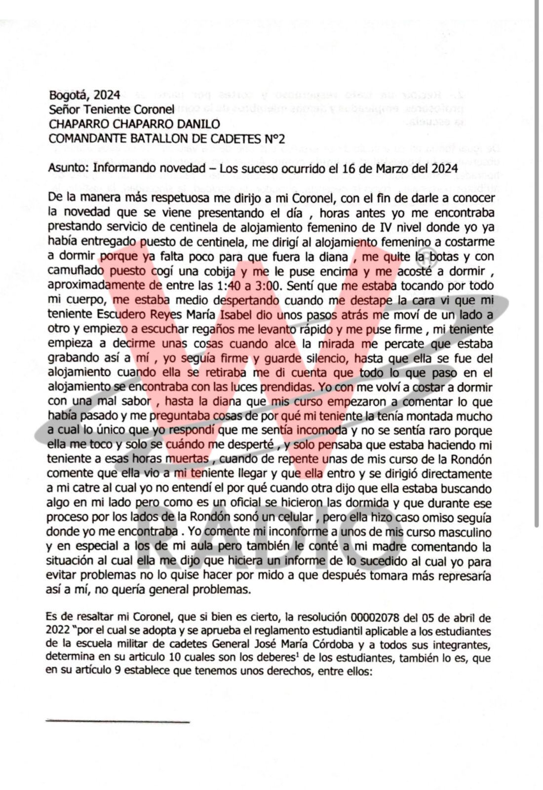 “Me estaba tocando todo mi cuerpo. Me estaba medio despertando, me destapé la cara y vi que mi teniente Escudero dio unos pasos atrás, me moví de un lado a otro y empiezo a escuchar regaños, me levanto rápido y me puse firme. Mi teniente empieza a decirme unas cosas. Cuando alcé la mirada, me percaté que estaba grabando, yo seguía firme y guardé silencio hasta que ella se fue del alojamiento. Cuando ella se retiraba, me di cuenta de todo lo que paso en el alojamiento”, señala el documento.