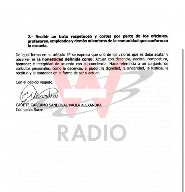 “Debió guardar silencio a fin de que no se le hiciera más persecución por parte de los comandantes. El modus operandi es ejercer presión frente a las actividades académicas y del servicio, degradándola en todo momento frente a sus compañeros y superior para que pudiera y pidiera la baja. Si investigan bien, se darán cuenta que en este momento hay varias estudiantes que se han quejado por hechos similares al acoso ejercido hacia mi hija”, añadió.