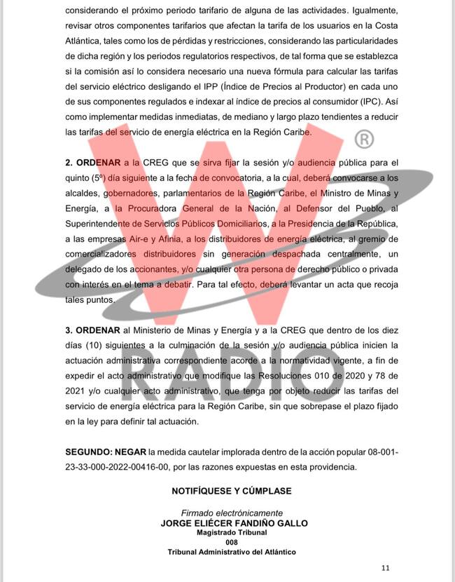 “Ordenar a la CREG que se sirva fijar la sesión y/o audiencia pública para el quinto (5º) día siguiente a la fecha de convocatoria, a la cual, deberá convocarse a los alcaldes, gobernadores, parlamentarios de la Región Caribe, el ministro de Minas y Energía, a la procuradora General de la Nación, al defensor del Pueblo, al Superintendente de Servicios Públicos Domiciliarios, a la Presidencia de la República, a las empresas Air-e y Afinia, a los distribuidores de energía eléctrica, al gremio de comercializadores distribuidores sin generación despachada centralmente, un delegado de los accionantes, y/o cualquier otra persona de derecho público o privada con interés en el tema a debatir”, señaló el fallo.