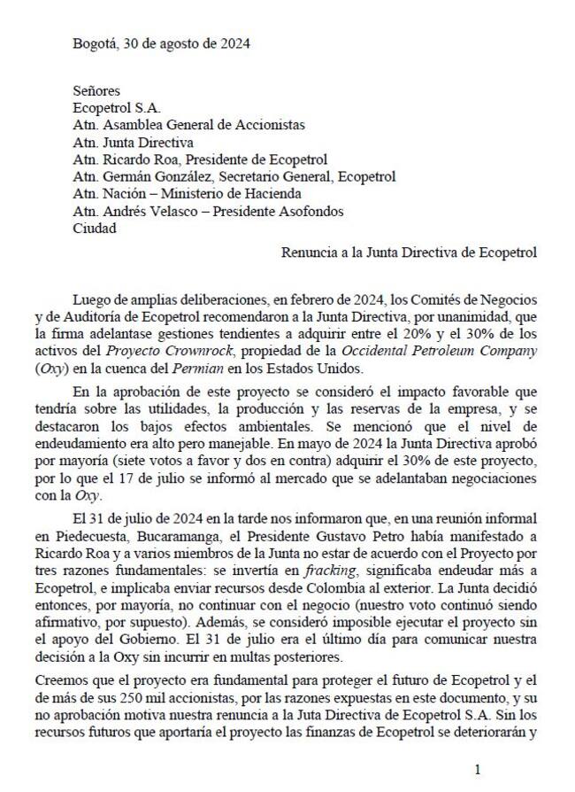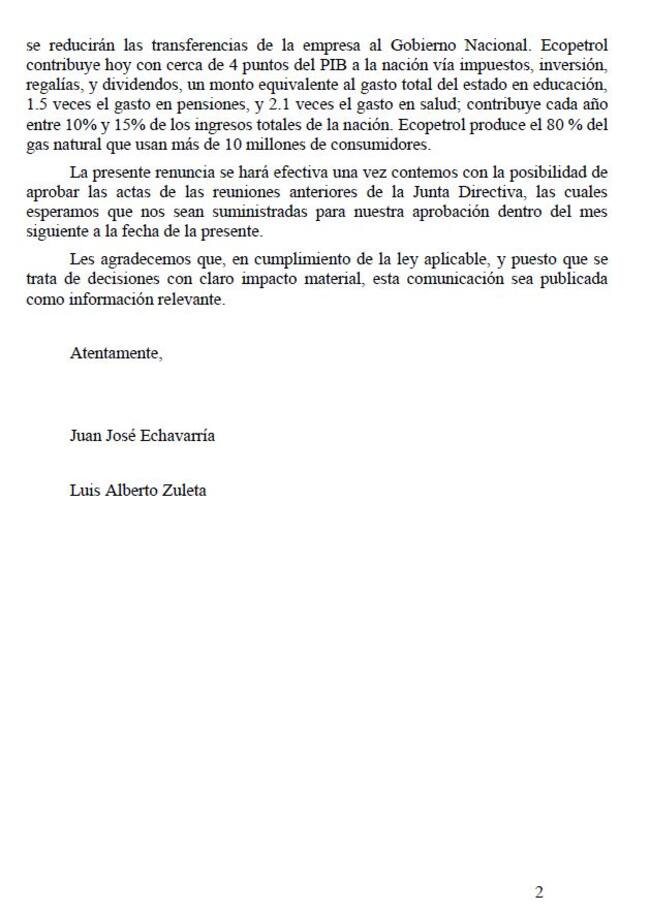 “Creemos que el proyecto era fundamental para proteger el futuro de Ecopetrol y el de más de sus 250.000 accionistas, por las razones expuestas, y su no aprobación motiva a nuestra renuncia a la Junta Directiva”, señalaron.
