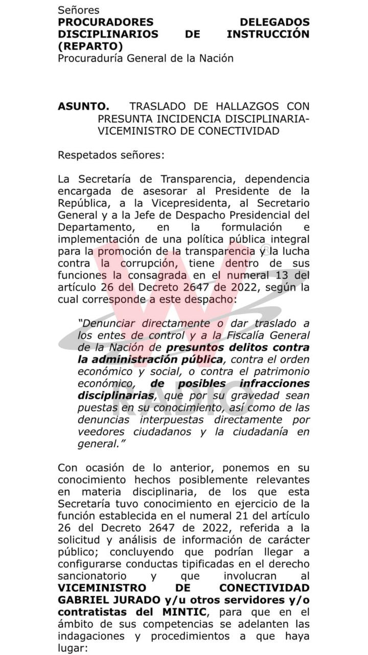 Sigue La W conoció en primicia el documento que la Secretaría de Transparencia radicó para que la procuradora general, Margarita Cabello, investigue las actuaciones del viceministro de Conectividad, Gabriel Jurado, y a otros contratistas por presunta falsedad en documento público.