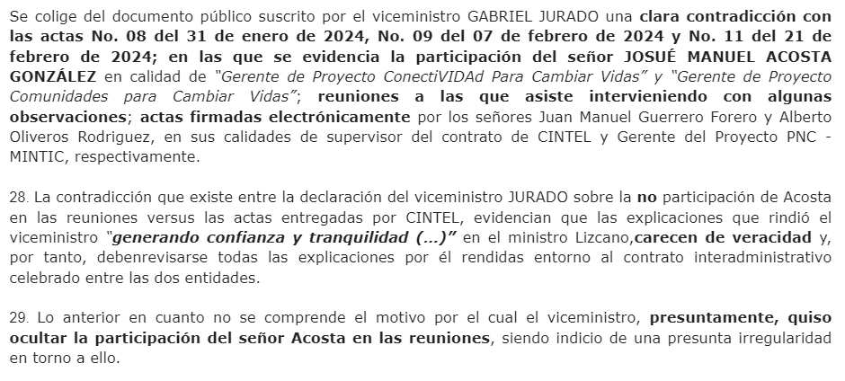 Pues en su momento, el viceministro Jurado dio un parte de tranquilidad y dijo que el señor Acosta era contratista del MinTIC, pero que no había participado en el contrato de Cintel, sin embargo, la Secretaría De Transparencia consiguió las actas de dicho proceso en donde el señor Acosta, amigo del viceministro firma como gerente del proyecto.