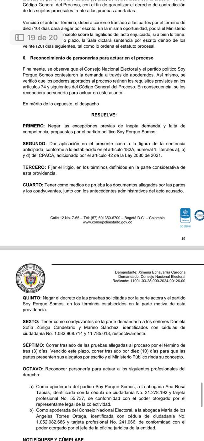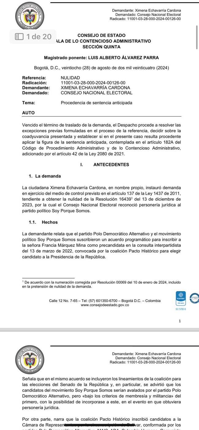 Recordemos que la abogada Ximena Echavarría demandó ante el Consejo de Estado la personería jurídica del movimiento político Soy Porque Somos, de la vicepresidenta Francia Márquez.