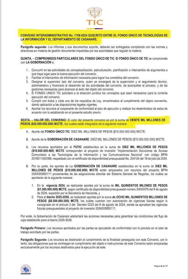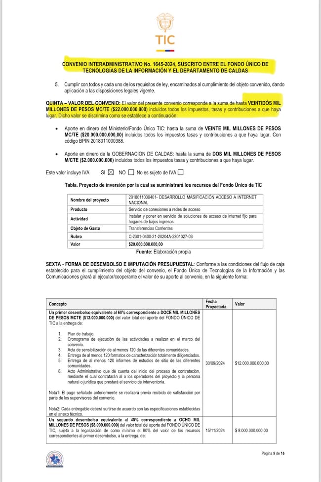 El tercer convenio es con la Gobernación de Caldas por 22.000 millones de pesos que tiene el mismo objeto “aunar esfuerzos técnicos, administrativos y financieros, para la implementación y ejecución del proyecto integral denominado “juntas de internet – comunidades de conectividad en el departamento de Caldas”.