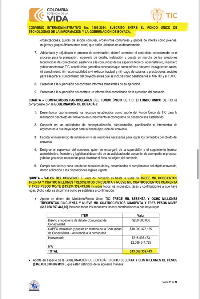 El segundo convenio administrativo es con la Gobernación de Boyacá por 13.000 millones de pesos con el mismo objetivo de “aunar esfuerzos técnicos, administrativos y financieros para la implementación y ejecución del proyecto integral piloto denominado “Comunidades de Conectividad en Boyacá”, con el fin de cerrar la brecha digital, promover la masificación del acceso a Internet en zonas rurales, apartadas y de difícil acceso en el departamento de Boyacá.