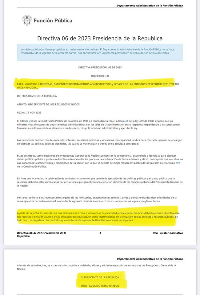 Con el fin de reducir la corrupción en la utilización de recursos públicos, el 14 de noviembre de 2023 salió una directiva del presidente Gustavo Petro que ordenaba a los ministros a ejecutar directamente sus recursos para así evitar acudir a otras entidades para que actúen como intermediarios en la ejecución de sus políticas y recursos públicos.