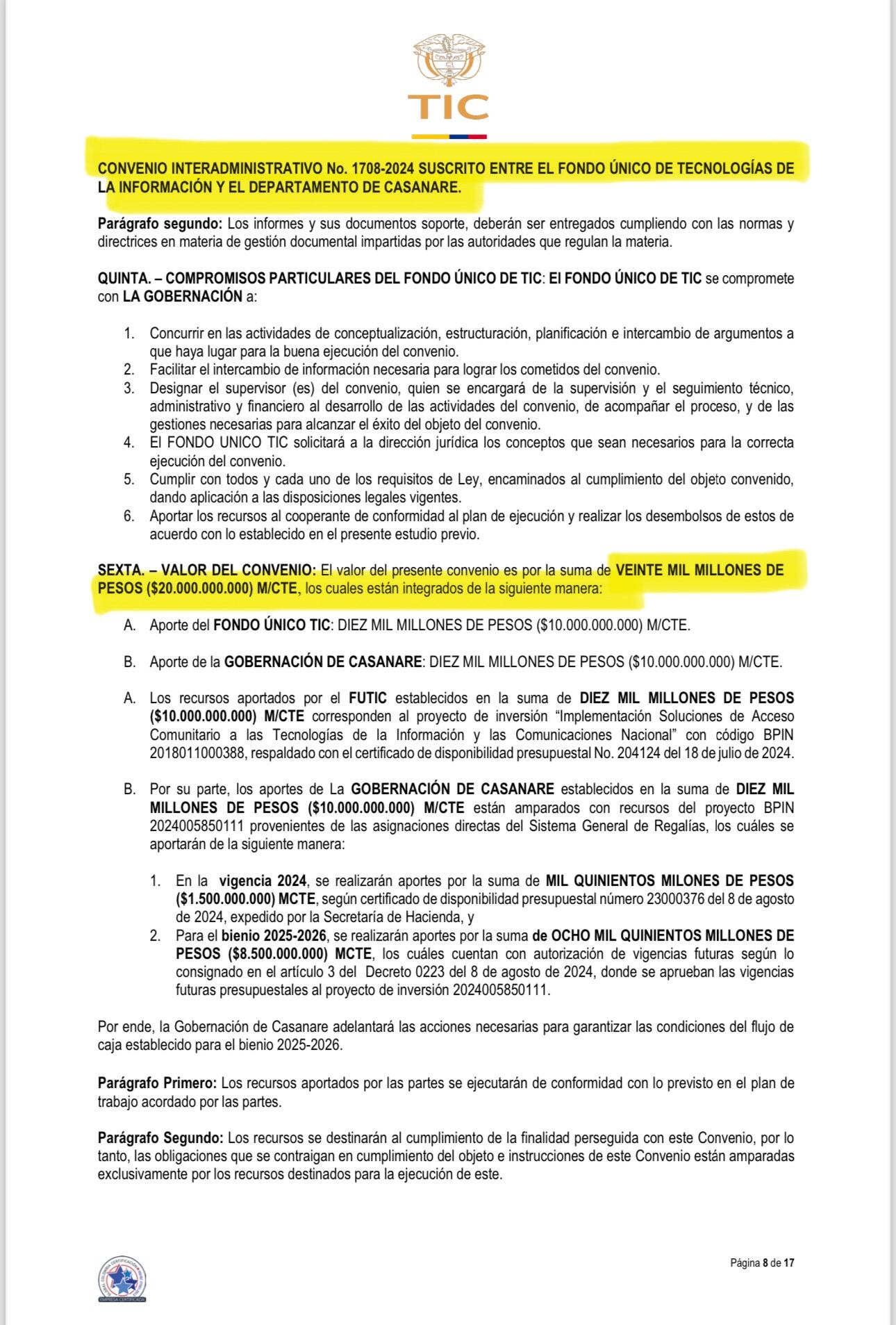 Serán aproximadamente 14 convenios interadministrativos de los cuales ya obtuvimos tres. El primero, firmado con la Gobernación del Casanare por 20.000 millones de pesos y tiene como objetivo “aunar esfuerzos técnicos, administrativos, financieros y jurídicos para la implementación de soluciones de acceso comunitario a las tecnologías de la información y las comunicaciones nacionales en el departamento de Casanare”.