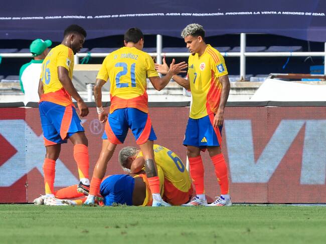 Jugadores de Colombia celebran un gol este martes, en un partido de las eliminatorias sudamericanas para el Mundial de 2026 entre Colombia y Argentina. Foto: EFE. / Ricardo Maldonado Rozo (EFE)