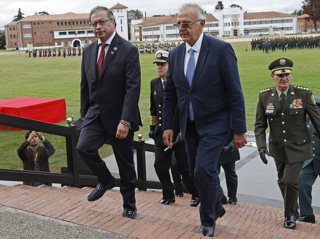 El presidente colombiano, Gustavo Petro (i), y el ministro de Defensa Iván Velásquez participan en la ceremonia de transmisión de mando del señor Comandante de las Fuerzas Militares, almirante Francisco Cubides, este martes en Bogotá (Colombia). El almirante Francisco Cubides asumió como nuevo comandante de las Fuerzas Militares y se convirtió así en el primer submarinista y buzo maestro de la Armada en llegar a ese cargo. EFE/ Mauricio Dueñas Castañeda