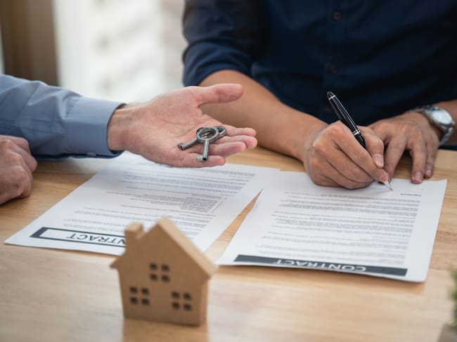 Dos personas firmando un contrato y entregando las llaves de la vivienda (Getty Images) / ronnachaipark