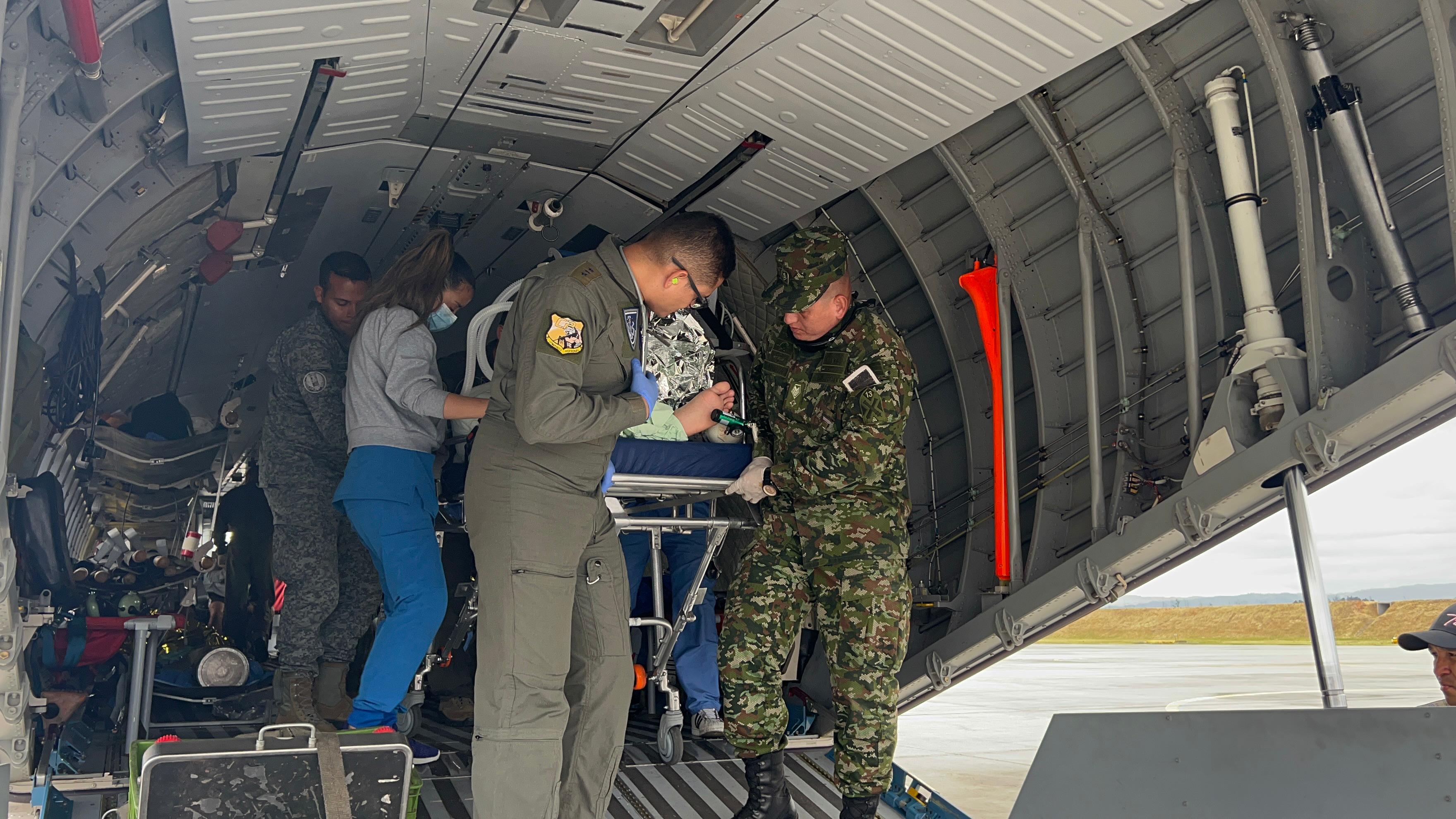 6 miembros del Ejército Nacional fueron trasladados por la Fuerza Aérea Colombiana. Foto: cortesía Fuerza Aérea Colombiana.