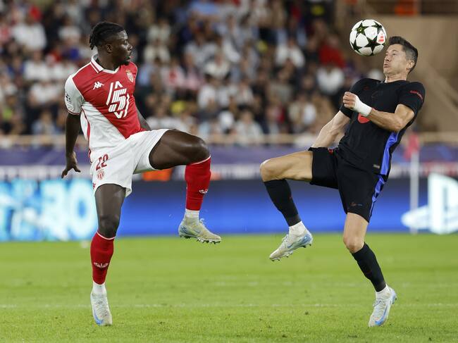 Monaco (Monaco), 19/09/2024.- Mohammed Salisu (L) of Monaco in action against Robert Lewandowski of Barcelona during the UEFA Champions League match between AS Monaco and Barcelona in Monaco, 19 September 2024. / SEBASTIEN NOGIER (EFE)