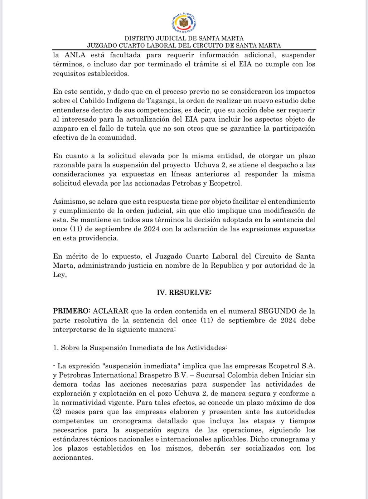 “No se ha ordenado un cierre definitivo del pozo Uchuva 2. Se aclara que la suspensión de las actividades está sujeta al cumplimiento de las condiciones establecidas en la sentencia, especialmente en lo referente a la realización de la consulta previa con la comunidad indígena de Taganga. En caso de que se cumplan con los plazos y requisitos establecidos para la consulta previa, se levantará la suspensión”.