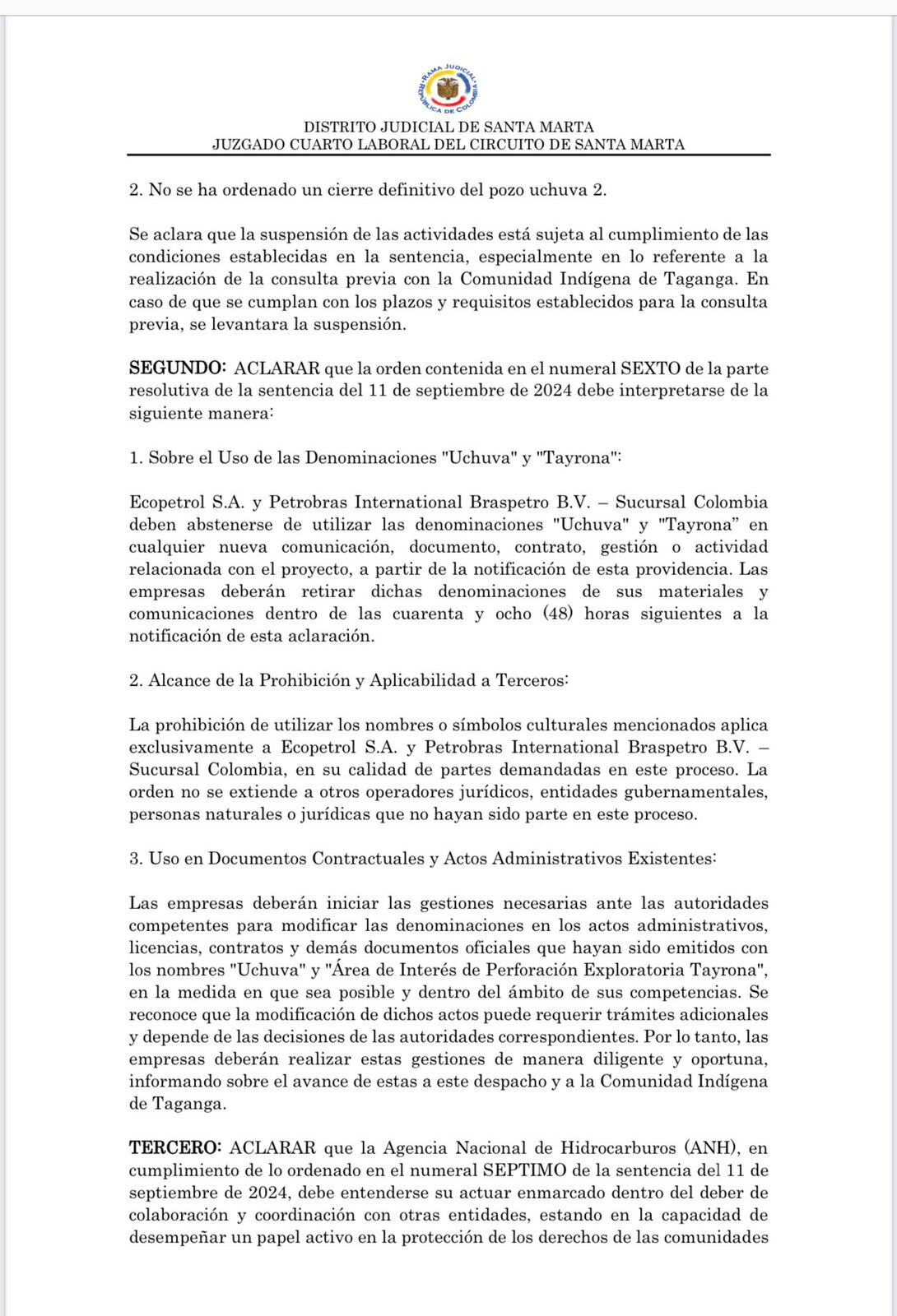 “Las empresas deberán iniciar las gestiones necesarias ante las autoridades competentes para modificar las denominaciones en los actos administrativos, licencias, contratos y demás documentos oficiales que hayan sido emitidos con los nombres ‘Uchuva’ y ‘Área de Interés de Perforación Exploratoria Tayrona’, en la medida en que sea posible y dentro del ámbito de sus competencias. Se reconoce que la modificación de dichos actos puede requerir trámites adicionales y depende de las decisiones de las autoridades correspondientes. Por lo tanto, las empresas deberán realizar estas gestiones de manera diligente y oportuna, informando sobre el avance de estas a este despacho y a la Comunidad Indígena de Taganga”.