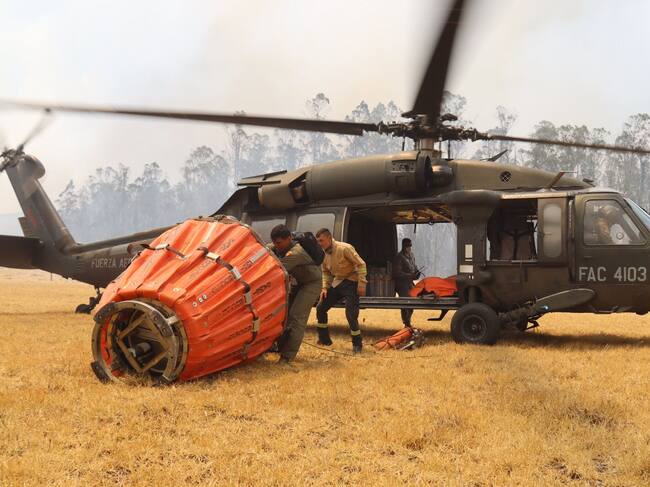 Un helicóptero UH-60 de la Fuerza Aérea, también con el sistema Bambi Bucket, busca desde el aire combatir el incendio que consume desde hace poco más de veinticuatro horas la reserva forestal de la vereda Barro Blanco, en Bojacá, Cundinamarca.
