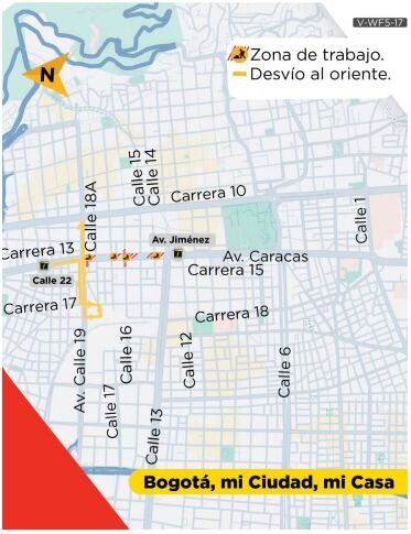 Las personas que se dirijan hacia el oriente de la ciudad desde la Av Caracas, deberán tomar la Avenida Calle 19, girar al sur por la Carrera 17, luego retomar su trayecto hacia el oriente y nuevamente por la Avenida Calle 19.