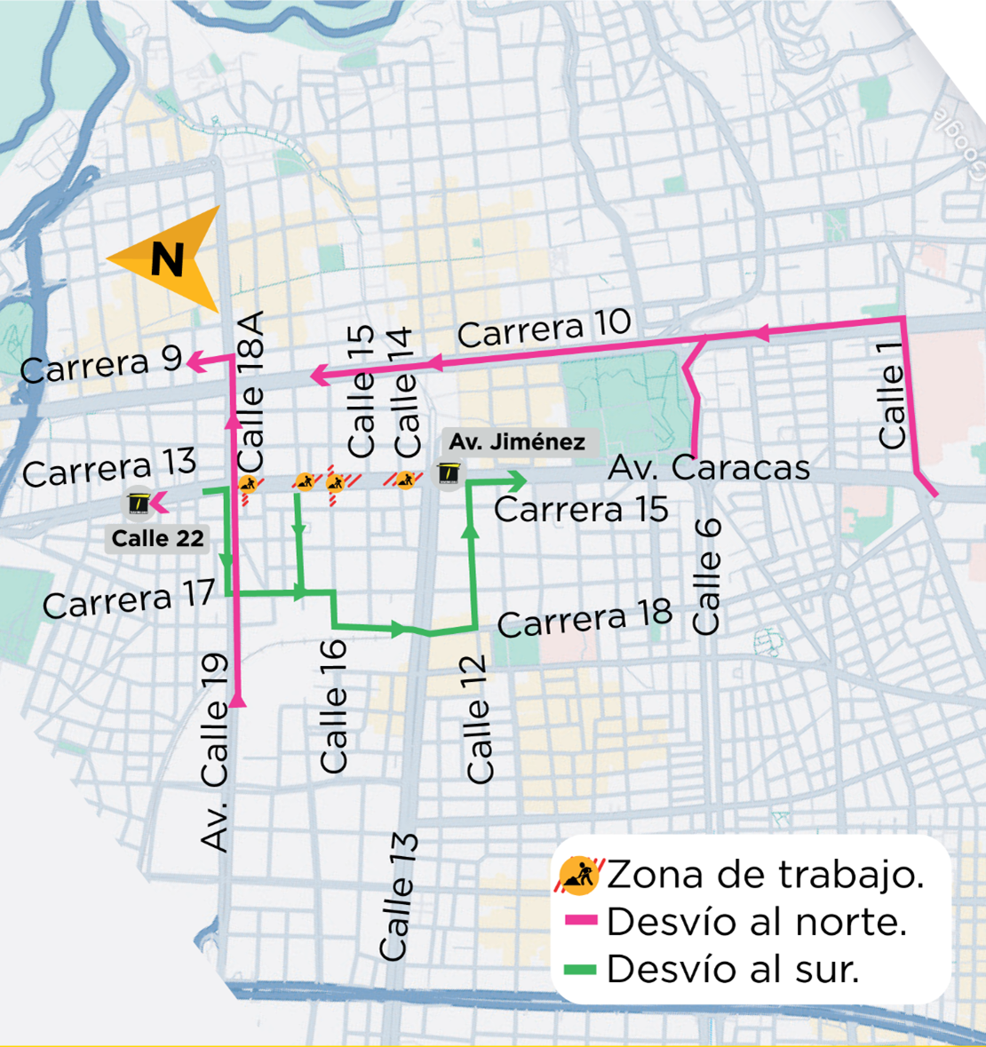 Los vehículos que se dirijan hacia el norte por la Avenida Caracas deberán desviarse por la calle 1ra o la calle 6ta, continuando hacia el oriente hasta llegar a la carrera 10ma, desde donde podrán retomar su trayecto hacia el norte.