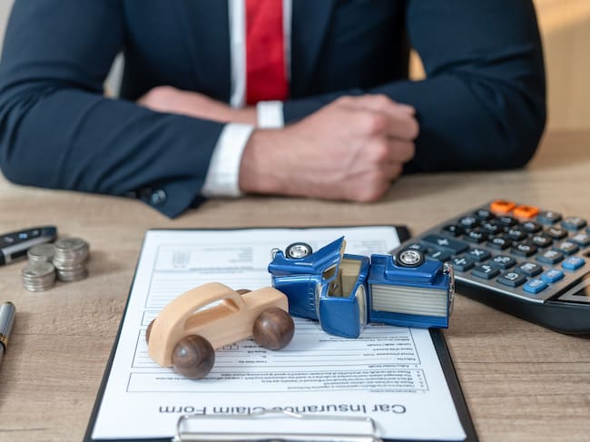 Carros de madera chocados sobre papeles de la aseguradora y con un abogado cruzado de brazos detrás (Getty Images) / boonchai wedmakawand