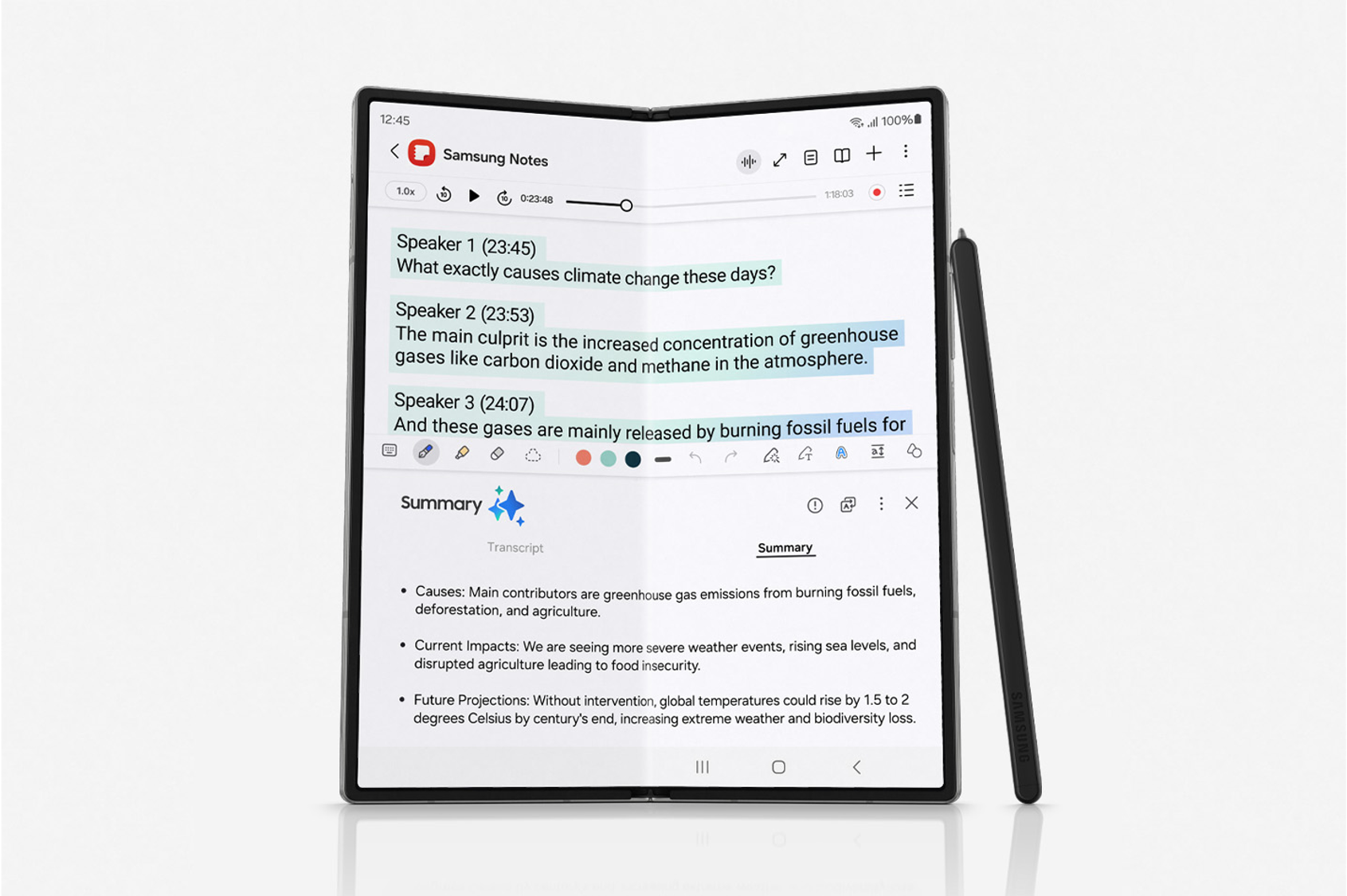 · Asistente de notas: está integrado en otros dispositivos Galaxy y accesible desde el teclado Samsung, este asistente permite grabar el audio de reuniones y convertirlo automáticamente en texto, facilitando la toma de notas y la organización de estas.