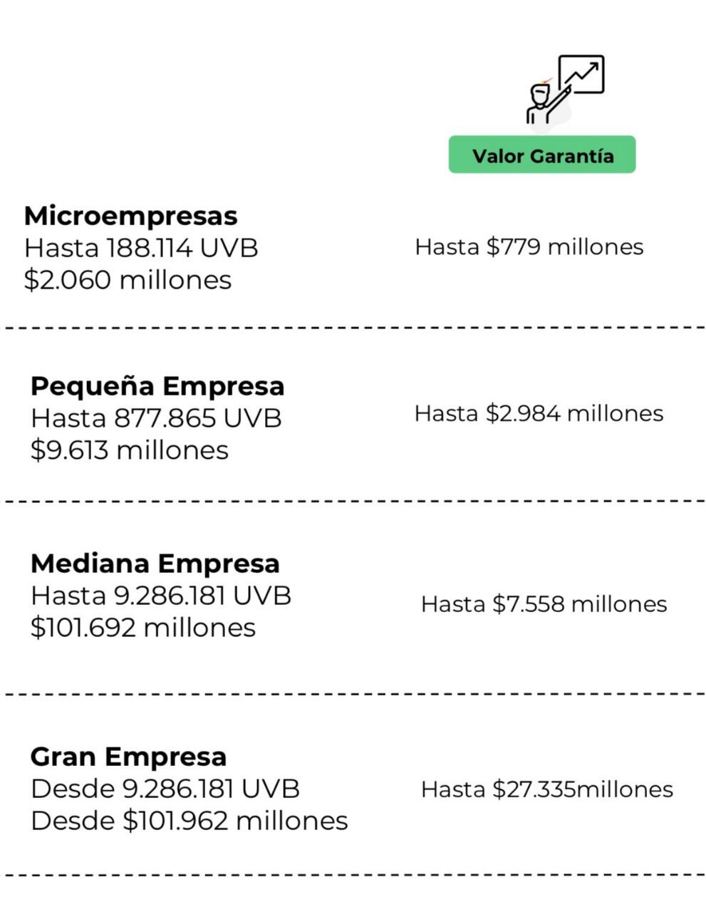 Además, tenga en cuenta que la entidad también respalda los créditos de personas naturales o micronegocios desde los 0 a los 120 salarios mínimos.