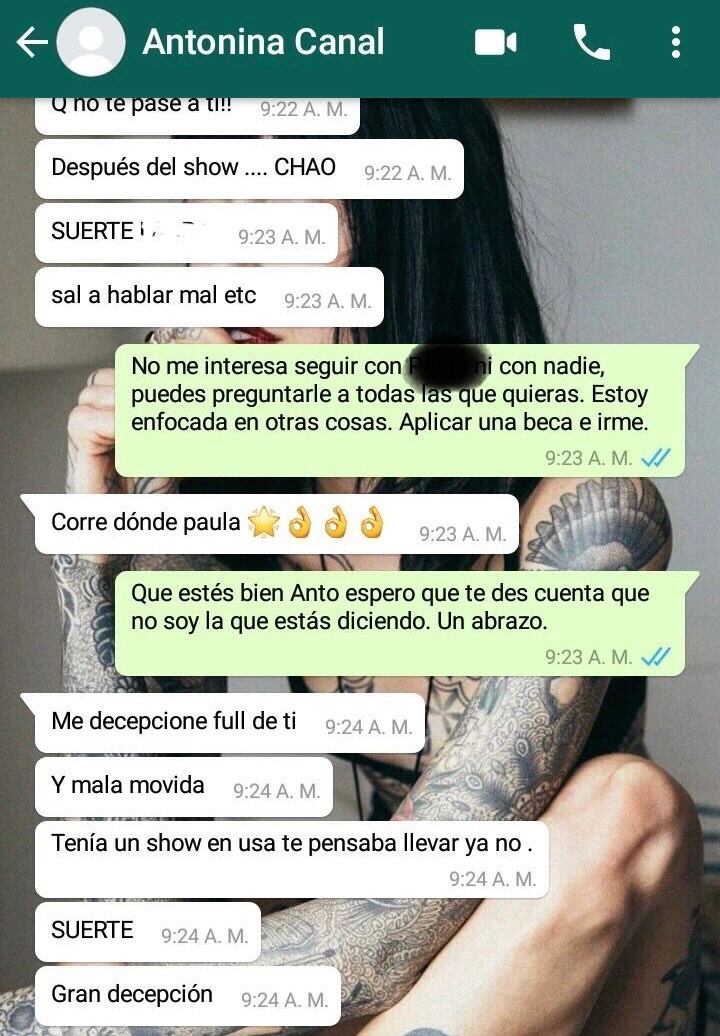 La W Radio hizo contacto con la bailarina Antonina canal y respondió mediante un comunicado que solo conocía una queja por presunto acoso laboral por una trabajadora que aún está vinculada a su empresa. Haciendo referencia a los salarios dijo que siempre los pagó puntualmente y sobre los malos tratos, dijo que siempre se ha dirigido a sus trabajadoras o colaboradoras con respeto y comprensión. Sin embargo, los audios y los chats que tenemos dicen lo contrario.
